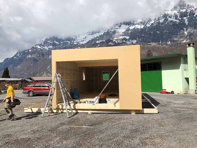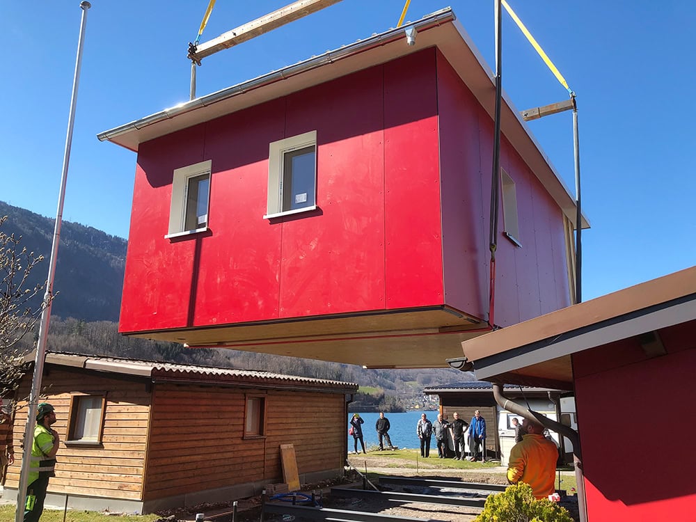 Auf dem Campingplatz in Walenstadt entstand dieses kompakte Mobilehome in moderner Elementbauweise. Das Mobilehome wurde direkt auf dem Parkplatz des Campings montiert und anschliessend per Kran an seinen endgültigen Standort gesetzt. Die markante rote Fassade verleiht dem kleinen Häuschen einen unverwechselbaren Charakter und fügt sich dennoch harmonisch in die Umgebung ein. Dank durchdachter Planung und effizienter Umsetzung bietet das Campinghaus auf kleinstem Raum hohen Komfort und eine langlebige Bauqualität.